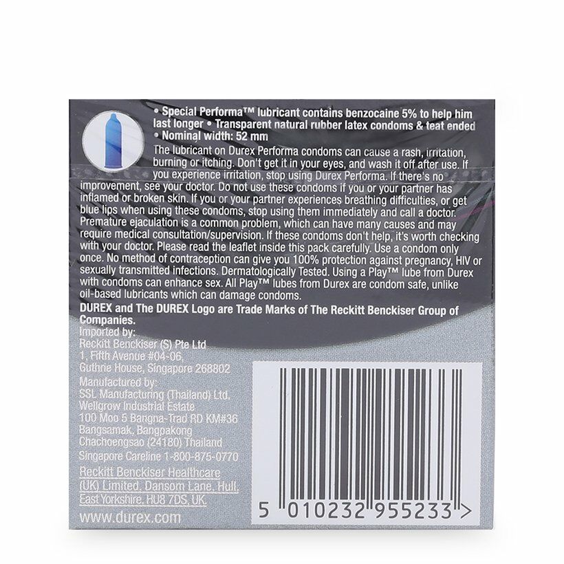Bao cao su Performa của thương hiệu Durex với thiết kế mỏng mới lạ, ấn tượng, dẻo dai, mang đến cảm giác chân thật cùng với chất Benzocaine kéo dài thời gian trong “cuộc yêu”. Đặc biệt, sản phẩm được sản xuất hoàn toàn bằng cao su thiên nhiên cao cấp cũng như đáp ứng các yêu cầu và điều kiện sản xuất nghiêm ngặt, đảm bảo an toàn tối đa cho người sử dụng.