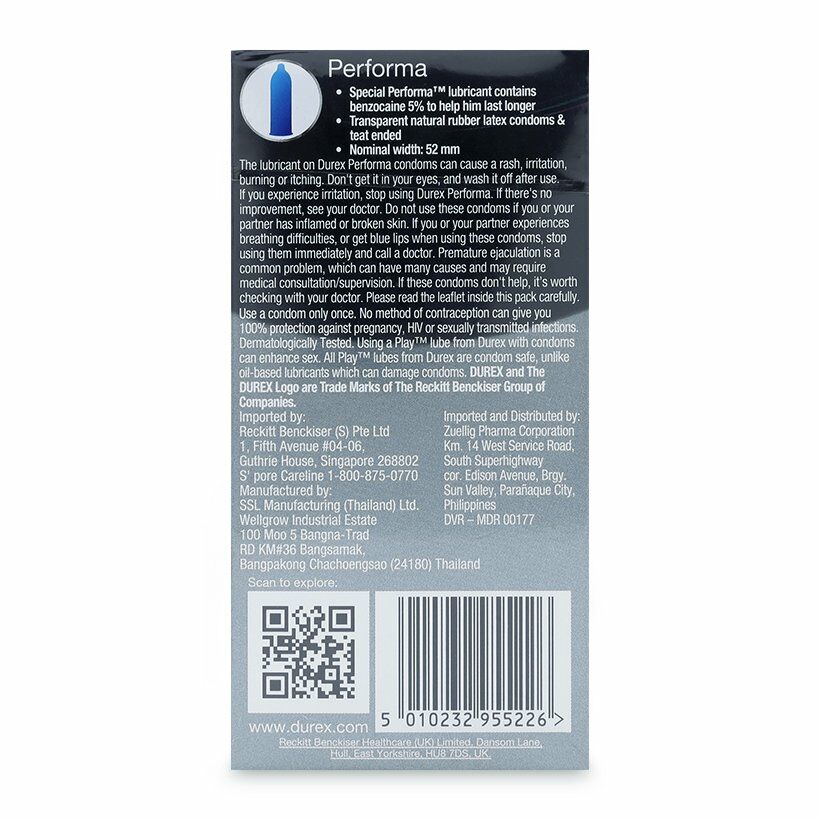 Bao cao su Performa của thương hiệu Durex với thiết kế mỏng mới lạ, ấn tượng, dẻo dai, mang đến cảm giác hứng thú, tăng cường độ cảm xúc trong “cuộc yêu”. Đặc biệt, sản phẩm được sản xuất hoàn toàn bằng cao su thiên nhiên cao cấp cũng như đáp ứng các yêu cầu và điều kiện sản xuất nghiêm ngặt, đảm bảo an toàn tối đa cho người sử dụng.