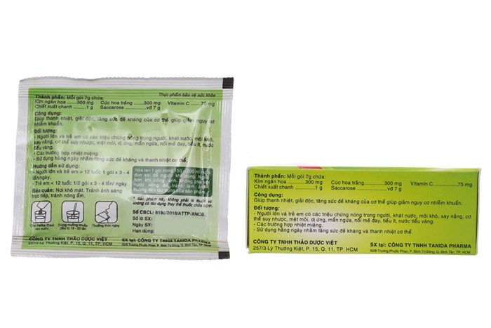 Hoạt chất: Kim ngân hoa 300mg, Cúc hoa trắng 300mg, Vitamin C 75mg, Chiết xuất chanh 100mg.