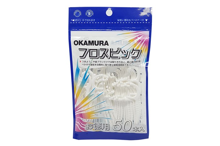- Tăm chỉ nha khoa Okamura với sợi chỉ làm từ nhựa tổng hợp có độ bền và đàn hồi tốt, sợi chỉ mỏng dai giúp dễ dàng luồn vào các kẽ răng.