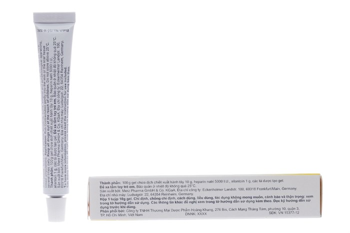 Hoạt chất: Dịch chiết xuất hành tây 10g, Heparin natri 5000 I.U., Allantoin 1g.