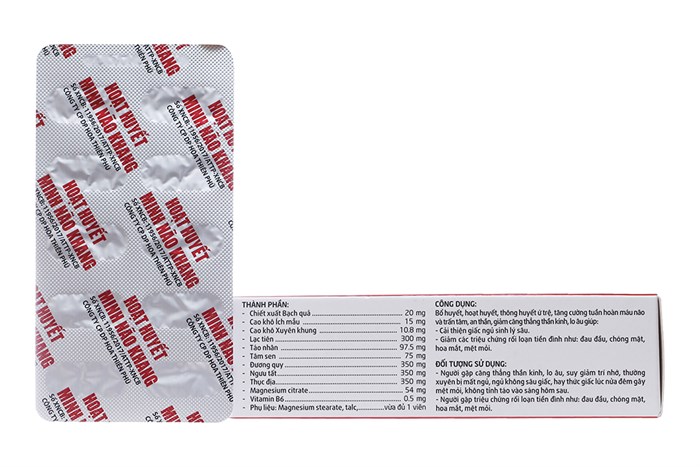 • Viên Hoạt huyết Minh Não Khang giúp bổ huyết (bổ máu), hoạt huyết, thông huyết ứ trệ. Giúp dẫn máu tới các chi, các bộ phận của cơ thể và giúp duy trì hoạt động tự nhiên của các chi, các bộ phận của cơ thể.