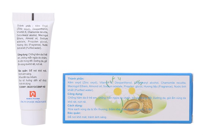 Kẽm oxyd, D-panthenol, Vitamin E, Chamomile recutita, Almond oil, Cetostearyl alcohol, Macrogol ethers, Na2EDTA, Propylen Glycol, Chất tạo hương, nước tinh khiết.
