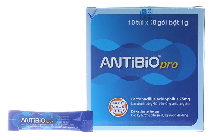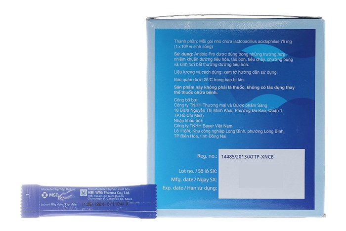 Mỗi gói Antibio pro nhỏ chứa Lactobacillus acidophilus 75mg (1 x 108 vi sinh sống).