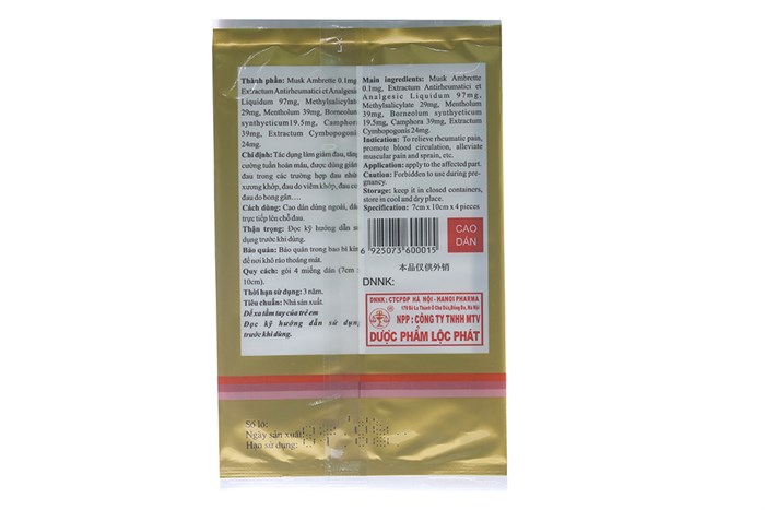 Hoạt chất: Musk Ambrette 0.1mg, Extractum Antirheumatici et Analgesic Liquidum 97.0mg, Methysalicylate 29.0mg, Mentholum 39.0mg, Borneolum syntheticum 19.5mg, Camphora 39.0mg, Extractum cymbopogonis 24.0mg.