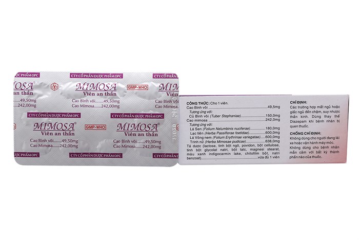 Cao bình vôi (tương ứng với củ bình vôi 150mg) 49,5mg; Cao mimosa (tương ứng với: lá sen 180mg; lạc tiên 600mg; lá vông nem 600mg; trinh nữ 638mg) 242mg