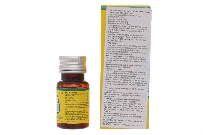 Mỗi ml có chứa:. Alpha-Amylase (Vi khuẩn 1: 800) 20mg. Papain U.S.P 10mg. Tinh dầu Dill B.P 2mg. Tinh dầu Anise B.P. 2mg. Tinh dầu Caraway B.P 2mg