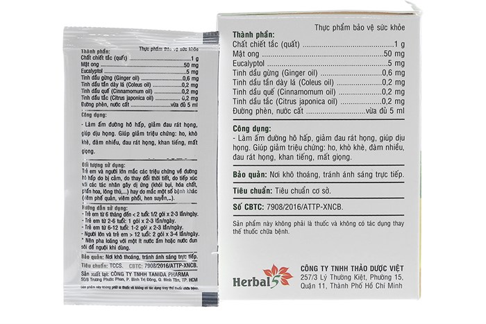 Hoạt chất: Chất chiết tắc (quất) 1g, Mật ong 50mg, Eucalyptol 5mg, Tinh dầu gừng 0.6mg, Tinh dầu tần dày lá 0.2mg, Tinh dầu quế 0.2mg, Tinh dầu tắc 0.2mg