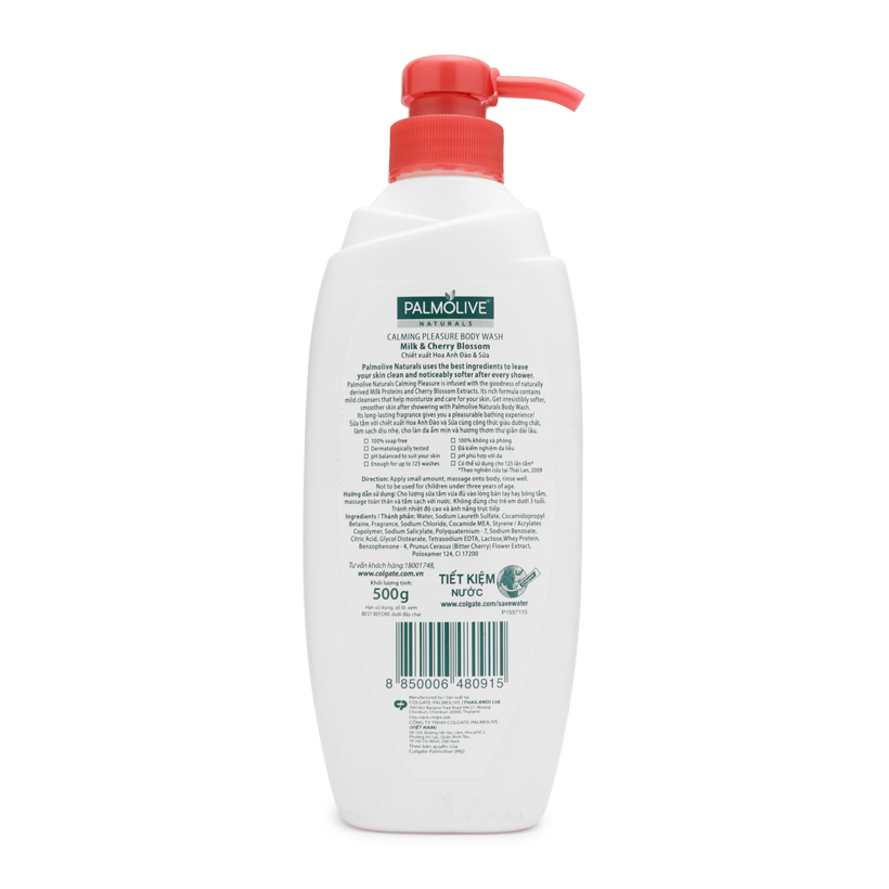 Sữa tắm sảng khoái dịu êm anh đào Palmolive với chiết xuất hoa anh đào và sữa cùng công thức giàu dưỡng chất, làm sạch dịu nhẹ, cho làn da ẩm mịn và hương thơm thư giãn dài lâu.