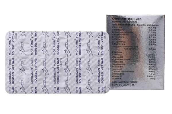 Acid amin thiết yếu: L-Leucin 18,3mg, L-Isoleucin 5,9mg, Lysin hydroclorid 25,0mg, L-Phenylalanin 5,0mg, L-Threonin 4,2mg, L-Valin 6,7mg, L-Tryptophan 5,0mg, L-Methionin 18,4mg, Acid 5-Hydroxyanthranilic Hydroclorid 0,2mg.