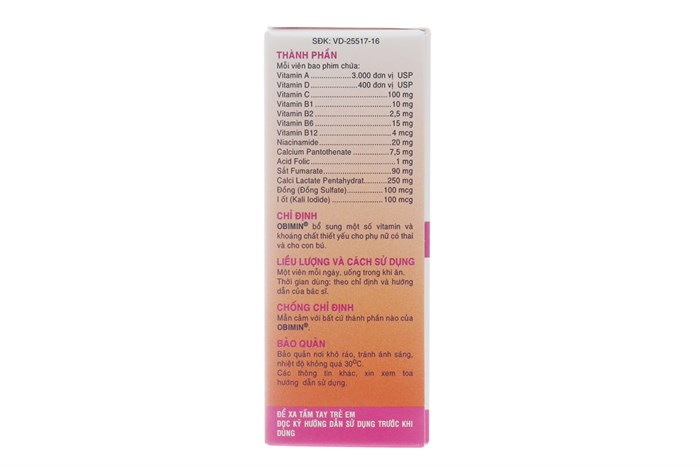 OBIMIN bổ sung một số vitamin và khoáng chất thiết yếu cho phụ nữa có thai và cho con bú.