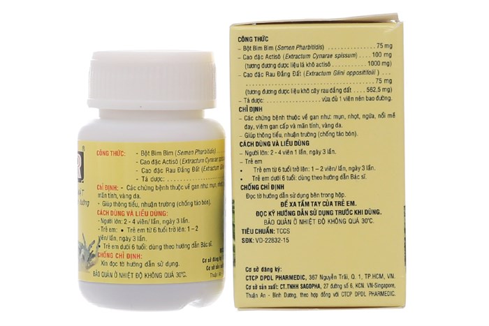 – Hoạt chất: Bột Bìm Bìm (Semen Pharbitidis) 75mg, Cao đặc Actisô (Extractum Cynarae spissum) 100mg (tương đương dược liệu lá khô actisô 1000mg), Cao đặc Rau Đắng Đất (Extractum Glinioppositifolii) 75mg (tương đương dược liệu khô cây rau đắng đất 562.5mg)