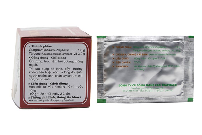 Trà gừng Traphaco có công dụng trục hàn, ôn trung, hồi dương, thông mạch, chỉ định dùng khi trị đau bụng do lạnh, đầy trướng không tiêu hoặc nôn, ỉa lỏng do lạnh, người nhiễm lạnh, chân tay lạnh, mạch nhỏ, ho do lạnh.
