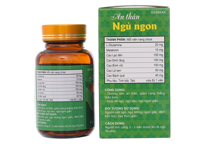 L – Glutamine 20mg, Melatonin 10mg, Cao Lạc tiên 150mg, Cao Đinh lăng 100mg, Cao Bình vôi 100mg, Cao Lá sen 50mg, Cao Bạch quả 40mg.