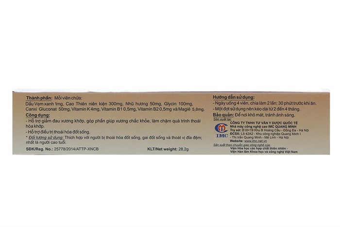 Dầu vẹm xanh 1mg, Cao Thiên niên kiện 300mg, Nhũ hương 50mg, Glycine 100mg, Canxi Gluconat 50mg, Vitamin K 4mg, Vitamin B1 0.5mg, Vitamin B2 0.5mg, Magie 5.8mg.
