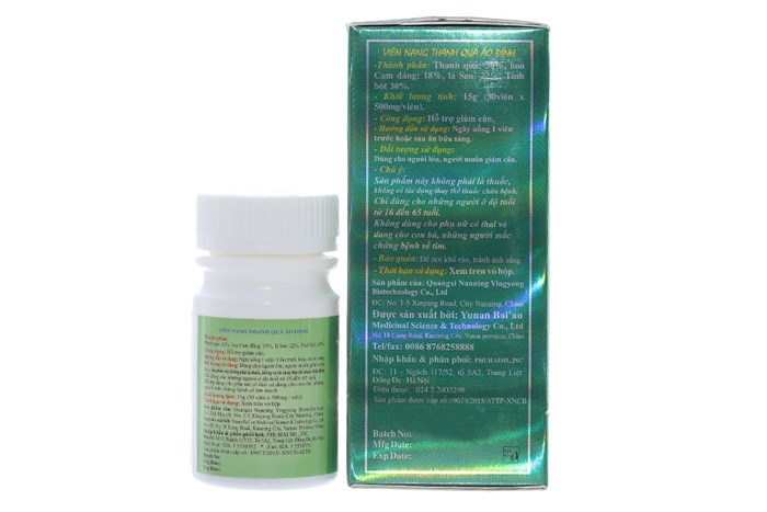 Thanh quả 30%, hoa Cam đắng 18%, lá Sen 22%, tinh bột 30%.