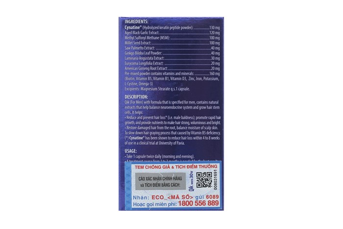 Cynatine 130mg, Aged Black Garlic Extract 120mg, Methyl Sulfonyl Methane (MSM) 100mg, Millet Seed Extract 100mg, Saw Palmetto Extract 40mg, Ginkgo Biloba Leaf Powder 40mg, Laminaria Angustata Extract 30mg, Eurycoma Longifolia Extract 20mg, American Ginseng Root Extract 20mg, Pre-mixed powder contains vitamins and minerals 160mg, Biotin, Vitamin B5, Vitamin B1, Vitamin D3, Zinc, Iron, Potassium, L-Cystine, Omega-3, Magnesium Stearate vừa đủ 1 viên.